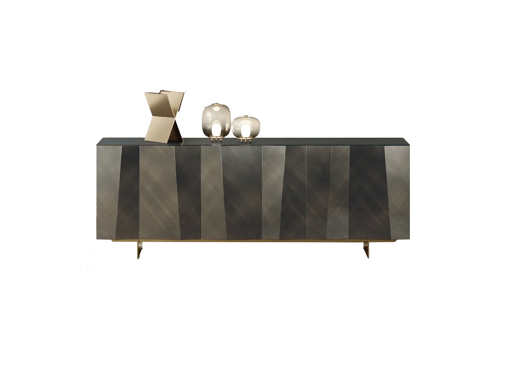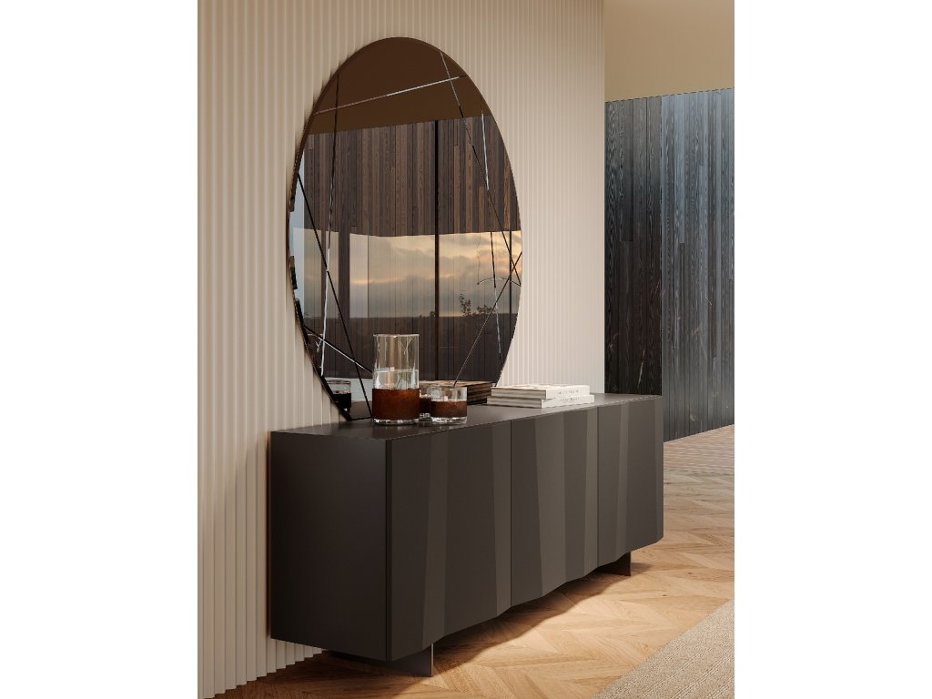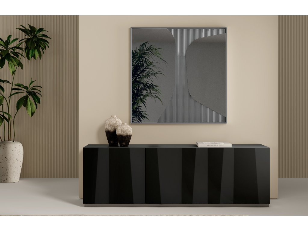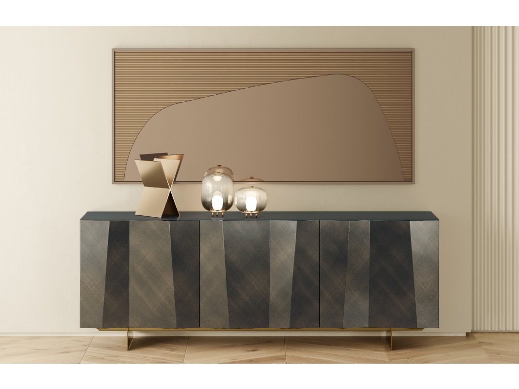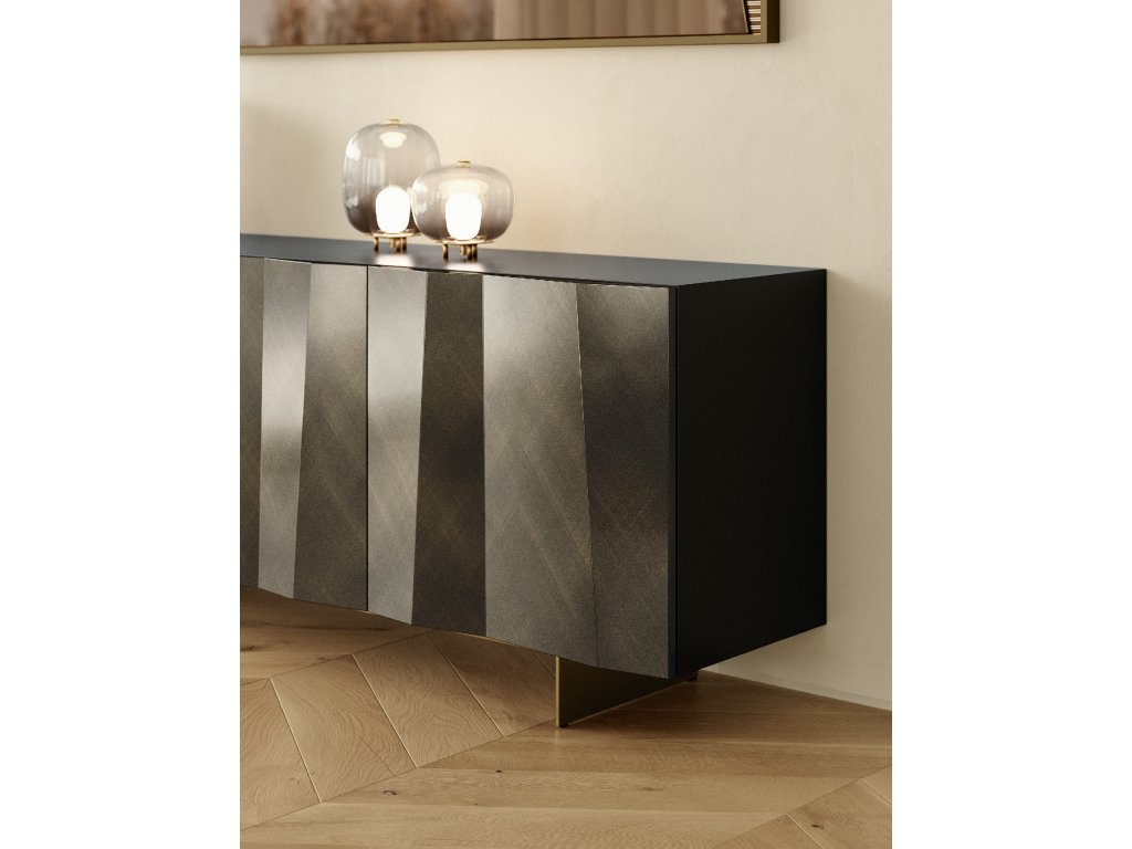 Komoda s dřevěným rámem a se dvěma/třemi dvířkami, vnitřní police z čirého skla. Boční panely z matného antracitově lakovaného dřeva L087 nebo matně černého lakovaného dřeva L090. Vše lze zvolit tak aby ladilo z předními panely/dvířkami. Na dotaz lze dodat i vrchní skleněnou desku, která je dodávána ve vybraném rozměru komody, případně lze zvolit i jiné provedení bočních panelů (lakované dřevo L081 nebo bronzové lakované dřevo L096).
