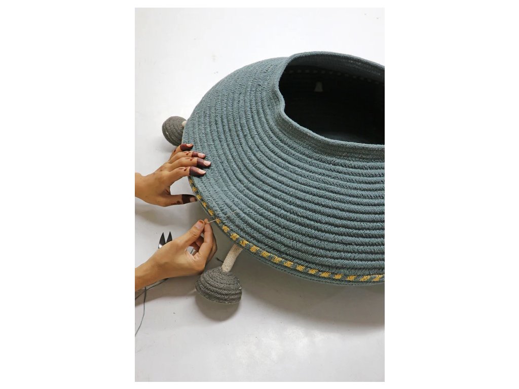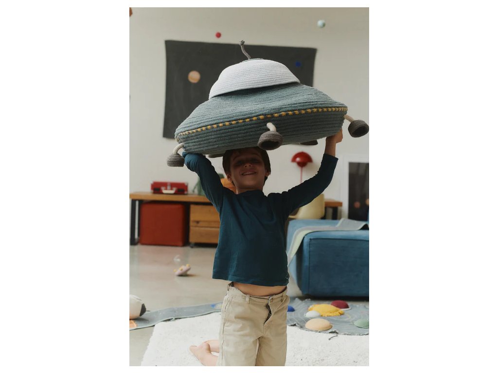 Další zastávka: Mars! Připrav se na meziplanetární dobrodružství s UFO košem a jeho mimozemským kamarádem. Tento velký, ručně vyráběný úložný koš ve tvaru létajícího talíře je upletený z bavlněných provazů a plněný recyklovanými PET materiály.