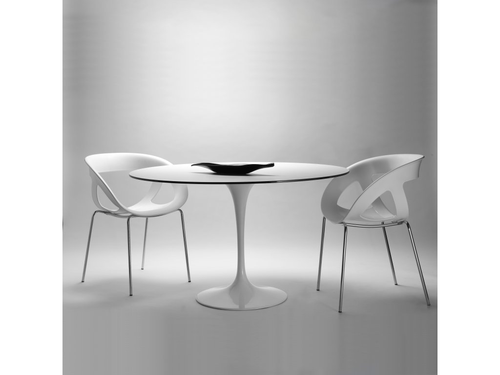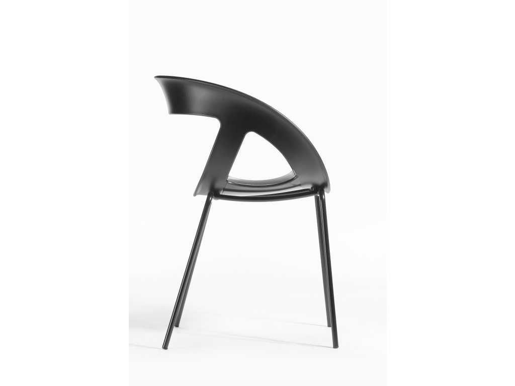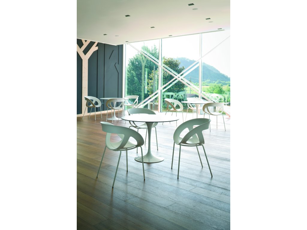 Židle Moema zaujme svým jemně organickým tvarem a minimalistickým provedením. Plastový (technopolymerový) sedák ladně navazuje na kovovou podnož, která je dostupná v několika barevných variantách. V lakovaném provedení (černá nebo bílá) je vhodná i pro venkovní použití.